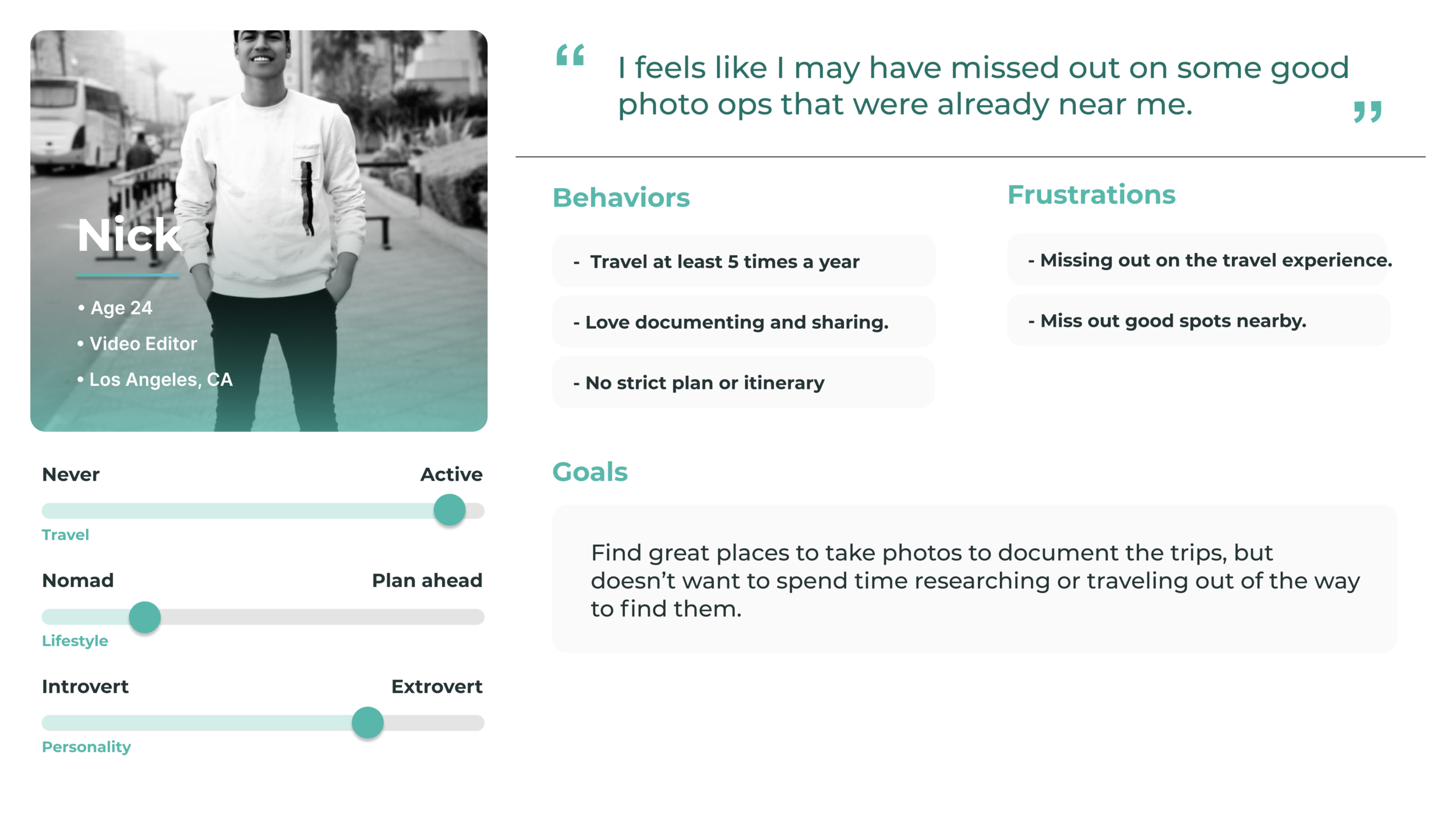 - User goals are to locate an awesome place to take photos anywhere and share the favorite locations and photos with others.